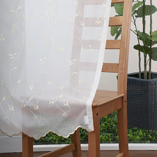 エレガンス、蔦の総柄を刺繍で施した形状記憶付きオーダーレースカーテンです。サイズオーダーやオプションがご利用いただけます。詳しくは店舗まで。